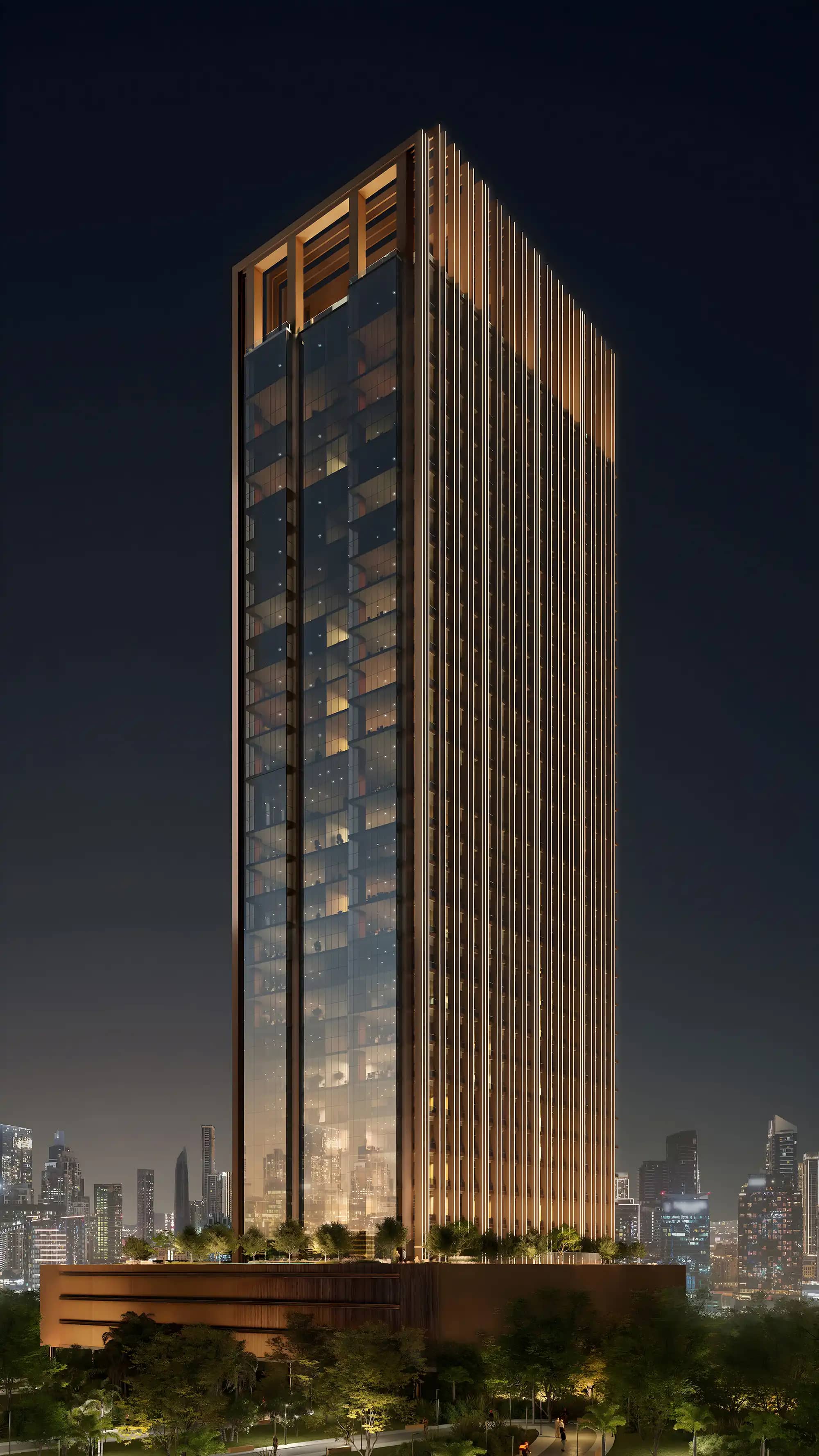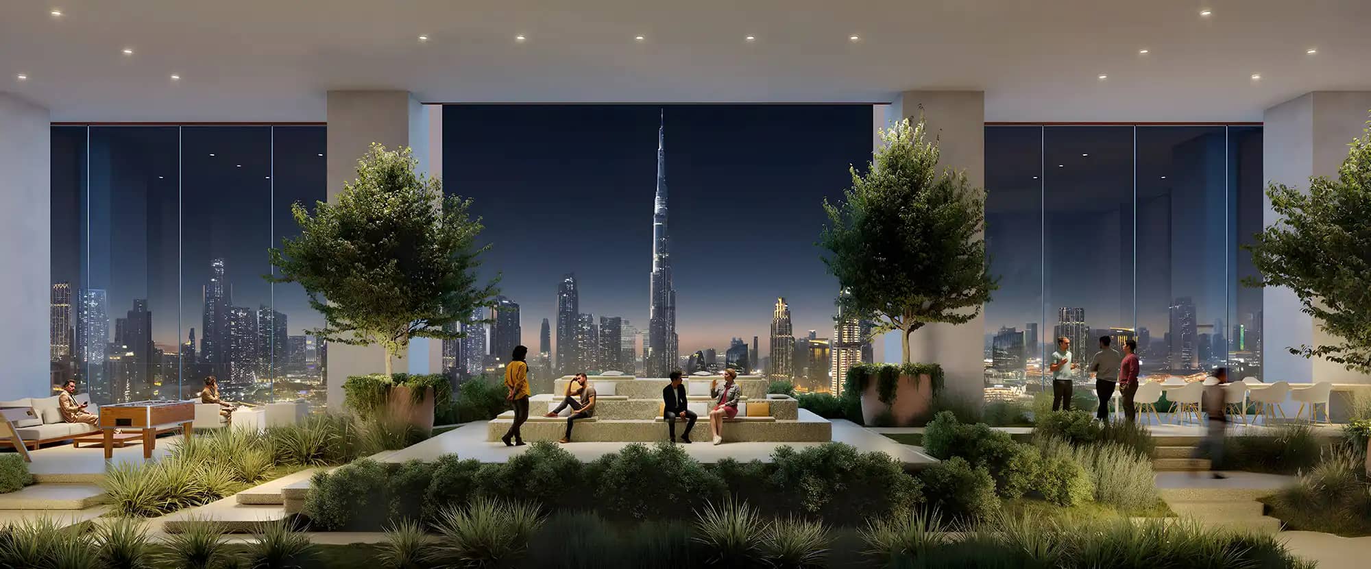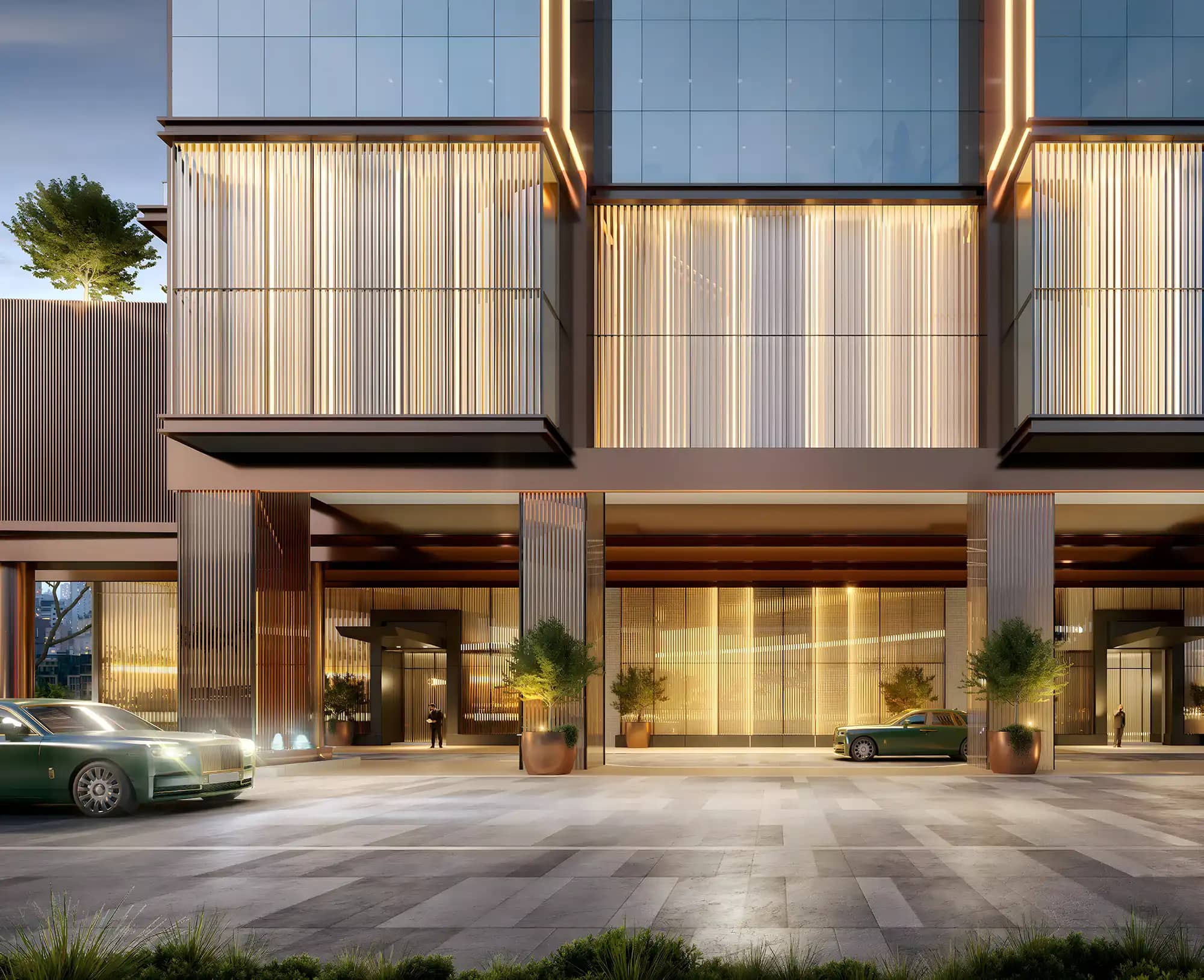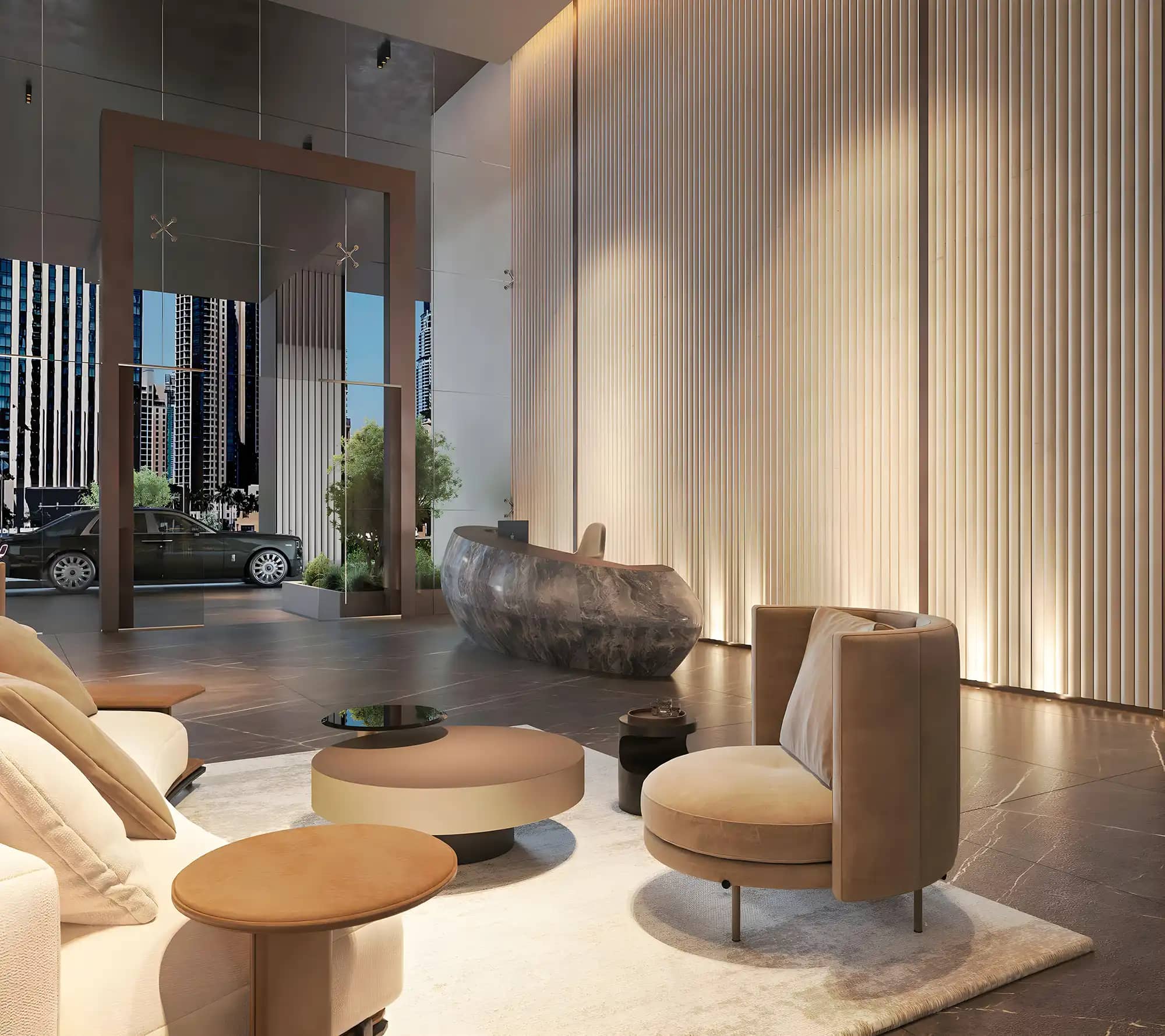 Парадное лобби высотой 33 метра с шестиметровыми потолками, двухуровневая drop-off зона, 18 скоростных лифтов и панорамные этажи с видами на Burj Khalifa и канал — всё говорит о представительском уровне проекта.
